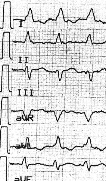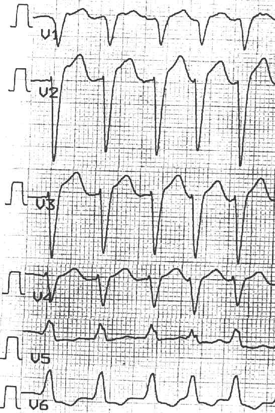 Tachycardes Vorhofflimmern um 120 - 150 / min., Linkslage, vollständiger Linksschenkelblock mit schulterförmiger ST-Hebung in V1 - V3 und verplumptem verbreitertem QRS-Komplex in V5, V6.