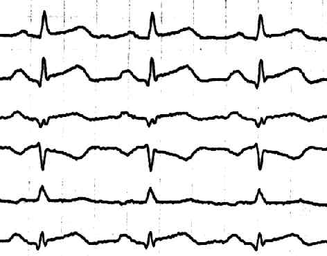 Normocarder Sinusrhythmus von 75/min., Linkslage, normale Erregungsbildung, St-Streckenhebungen diffus, so in (I), II, III, aVf, V3 - V6. Auskultatorisch laut knirschendes Pericardreiben, es liegt eine akute Perimyocarditis vor.