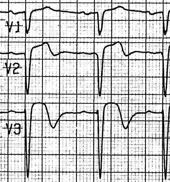Normocarder Sinusrhythmus von 74 / min., Sagittaltyp, normale Erregungsbildung, -ausbreitung, Q in V1,V2, r V3,V4, schulterförmige ST-Hebungen von V2-V5, bereits terminal negative T-Wellen als Ausdruck des frühen subacuten Vorderwandinfarktes.