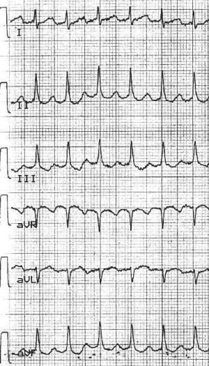 Schmalkomplextachycardie von 145 / min., Steillage, Ort der Erregungsbildung unklar, angedeutet wannenförmiger ST-Streckenverlauf lateral.