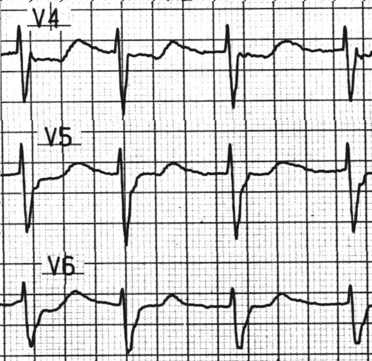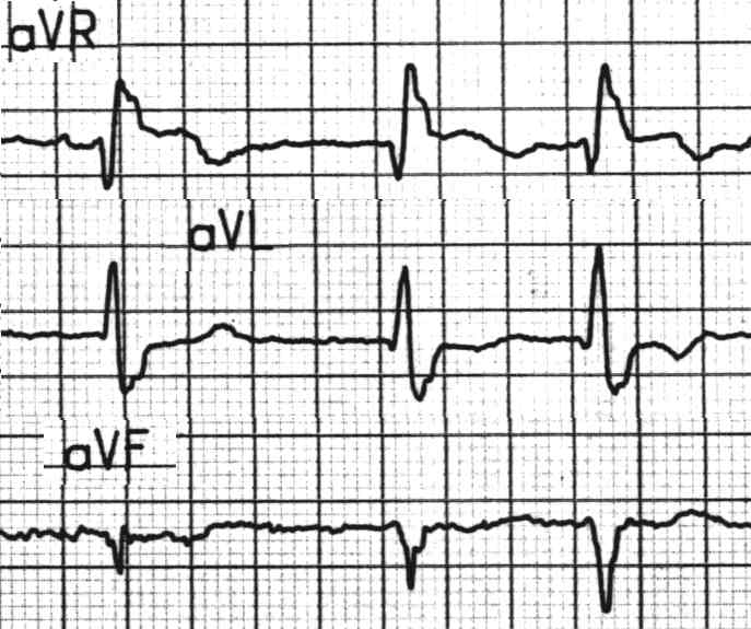 Normfrequentes Vorhofflimmern um 90 / min., überdrehte Rechtslage, kompletter Rechtsschenkelblock, kombination mit rechtsposteriorem Hemiblock whs., entsprechende T-Negativierungen diskordant zum rR'-Komplex d.h. negativ in V1 - V3.