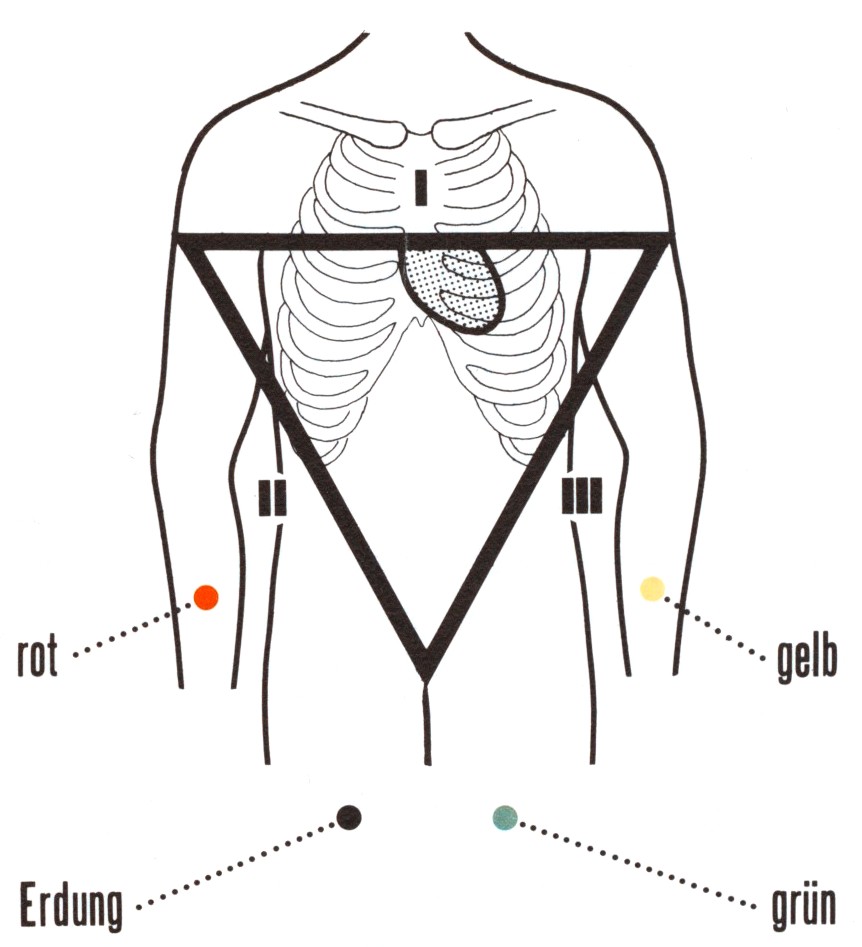 jeweils von einer Extremitäten- Elektrode wird gegen die beiden andern als indifferente Elektrode (Nullpunkt, Erdung) abgeleitet