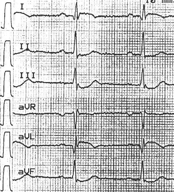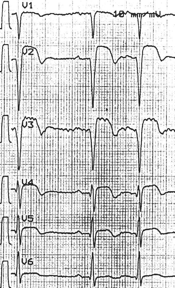 Normocarder Sinusrhythmus, Linkslage, no. Erregungsbildung, AV-Block I°, schulterförmige ST- Streckenhebungen von V1 - V5 im Rahmen eines akuten Vorderwandinfarktes.